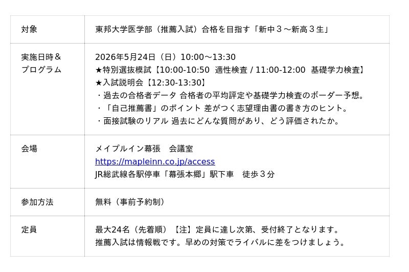 リソー教育グループ(本社:東京都豊島区、代表取締役社長:天坊真彦)の子会社である、株式会社名門会(本社:東京都豊島区、代表取締役社長:吉田信司)は、2026年5月24日(日)に「第1回 東邦大学医学部 特別選抜模試」を千葉市・幕張にて開催いたします。