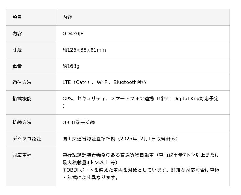 本製品は、2026年4月施行の改正物流効率化法により求められる、荷待ち・荷役・運行の可視化および報告対応を支援するソリューションとして開発されました。車両に差し込むことで導入できる簡便性と、高頻度のデータ取得による実態把握を両立し、物流事業者のみならず荷主企業にとっても重要となる物流データ基盤の構築を支援します。なお、本製品はこれまで型式名「OD420JP」として発表してまいりましたが、本日の注文受付開始に合わせ、商品名「Will-Fleet」を正式に決定いたしました。
