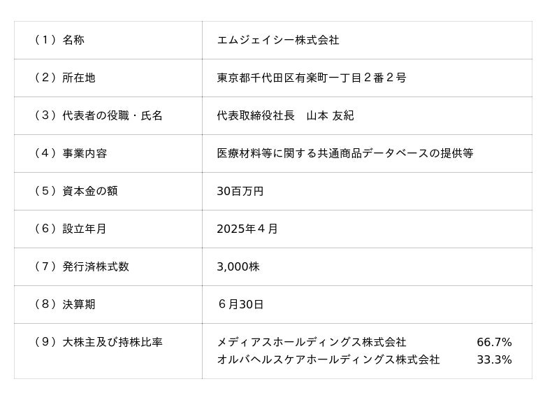 メディアスホールディングス株式会社(本社:東京都千代田区、代表取締役社長 池谷 保彦、以下メディアスHD)は、子会社であるエムジェイシー株式会社(本社:東京都千代田区)が、医療材料マスタデータの標準化を目的とした事業を、オルバヘルスケアホールディングス株式会社(本社:岡山県岡山市)と2026年7月より開始することといたしましたのでお知らせいたします。