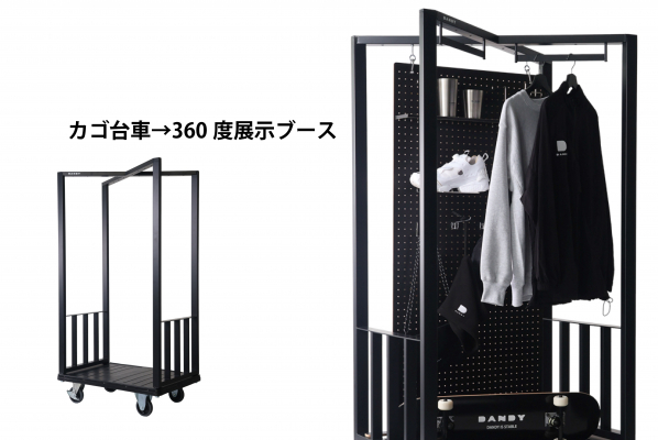 最大の特徴は、上部に設けられたクロス構造です。このクロス部分にはハンガーオプションを取り付けることで衣類やアイテムを吊り下げられ、さらに有孔ボードオプションを組み合わせると、展示スペースとして活用できます。荷台部分にはソファやテーブルを置くことで、簡易的な休憩スペースにもなり、ホテルや商業施設での使い方が大きく広がります。
