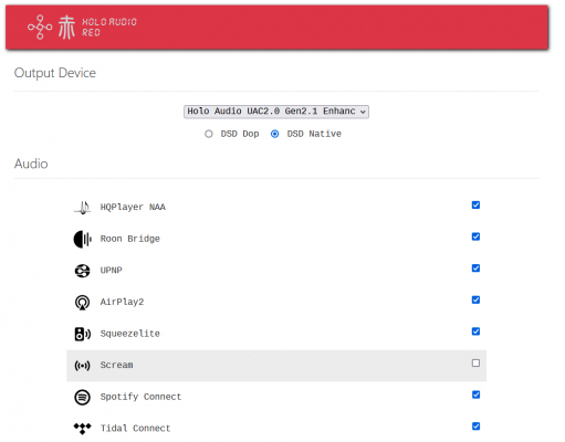 設定はREDと同一のネットワーク上に接続されているPCやスマートフォンのブラウザーから行います。接続するUSB DACの選択や有効にする伝送プロトコル選択、システムOSのアップデートなどを簡単に行うことができます。