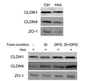 分化させた表皮細胞において、ヒスタミンによるタイトジャンクション関連因子のタンパク質発現量低下および細胞間発現の低下を、異性化糖(SI)とグリチルリチン酸ジカリウム(DPG)が抑制するかを、ウェスタンブロッティング法と免疫染色法により、観察しました。