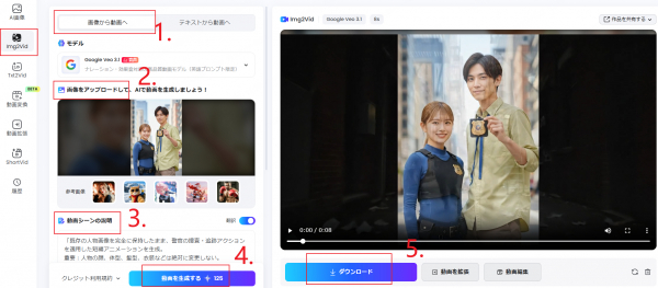生成した画像から「動画を生成」機能を通じて動画制作ページへ移動し、AIが自動でカメラワークや動き、表情変化などを付与した短尺動画を生成できます。