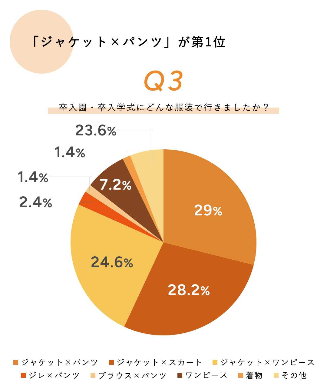 「ジャケット×パンツ」派が最も多く、続いて「ジャケット×スカート」「ジャケット×ワンピース」という回答になりました。反対に「着物」は少数派になり、ジャケットを合わせた洋服に意見が集まりました。