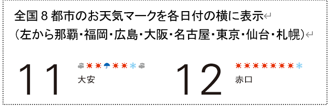 カレンダーの各日付には全国 8 都市の天気予測を記載し