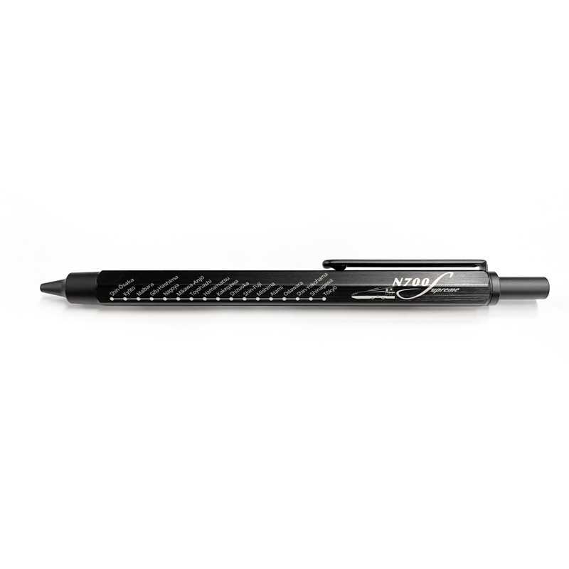当社公式オンラインショップでは、ほどよい重量感と手触り感はそのままに、ボールペン2色(ブラック・レッド)、メカニカルペンシルの3 機能を搭載した「マルチペン」も販売中です。本体にはこだわりのアングルで描いた「N700S」のイラストを刻印するとともに、N700Sの車両イラスト・ロゴを組み合わせたダブルデザインを施しました。