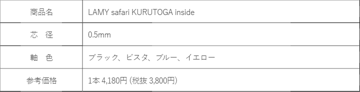 今回は、その第2弾として、新規設計モデル『LAMY safari KURUTOGA inside』をLAMYブランド商品として新発売いたします。「KURUTOGA」は、シリーズ累計販売本数1億本を突破し、“芯が回ってトガりつづける”という特長は日本市場を中心に好評いただいており、「LAMY safari」のデザイン性の高い軸にクルトガ機能を搭載することで、新たな価値を提供しブランド認知を拡大してまいります。