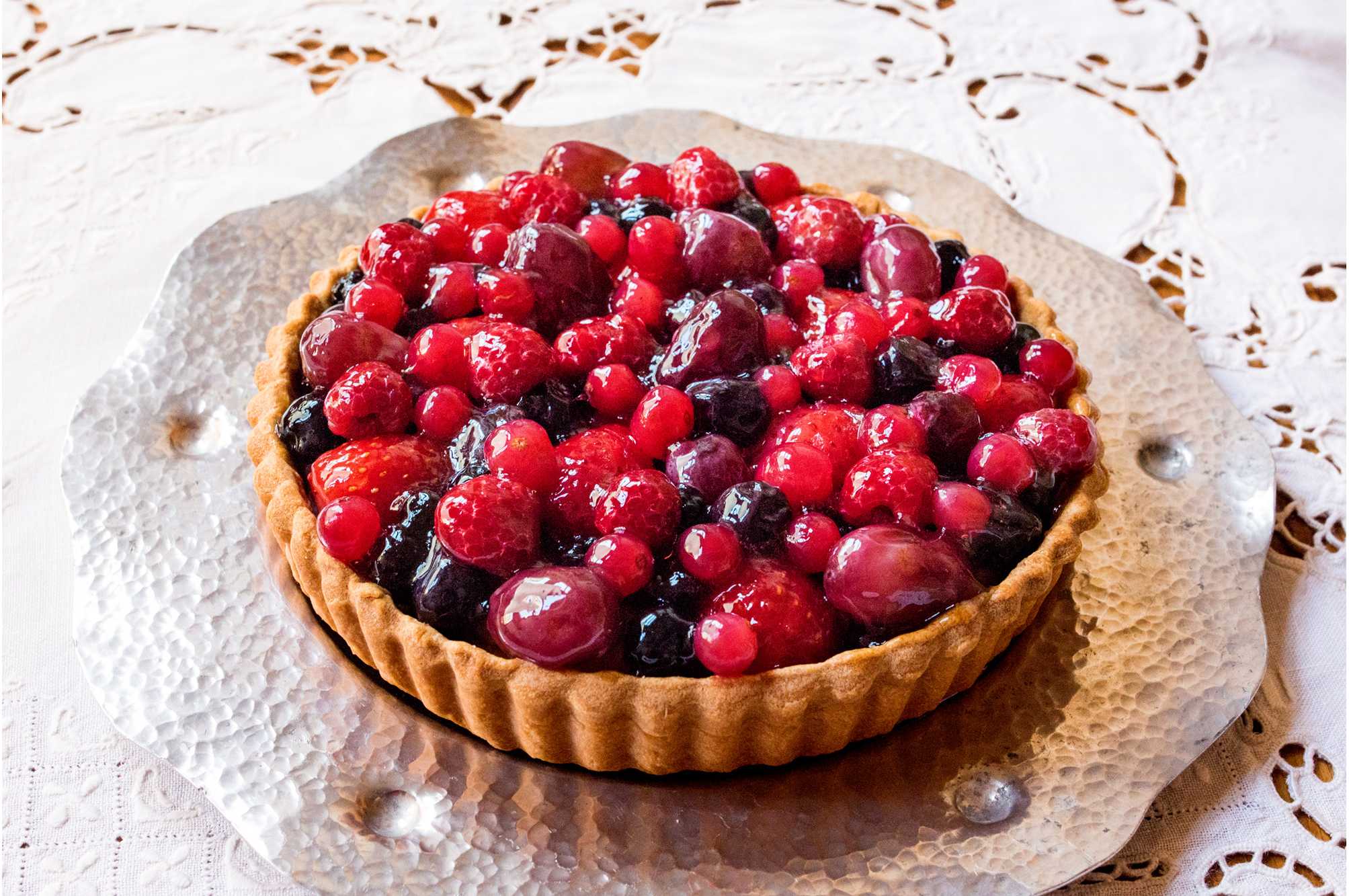 イチゴをはじめ数種のベリーやぶどうなど、甘酸っぱいフルーツをたっぷりと飾った華やかなタルトです。爽やかな酸味とまろやかなコクのサワークリームをたっぷりと使用し、仕上げにシナモンを振った風味豊かなタルトと組み合わせました。