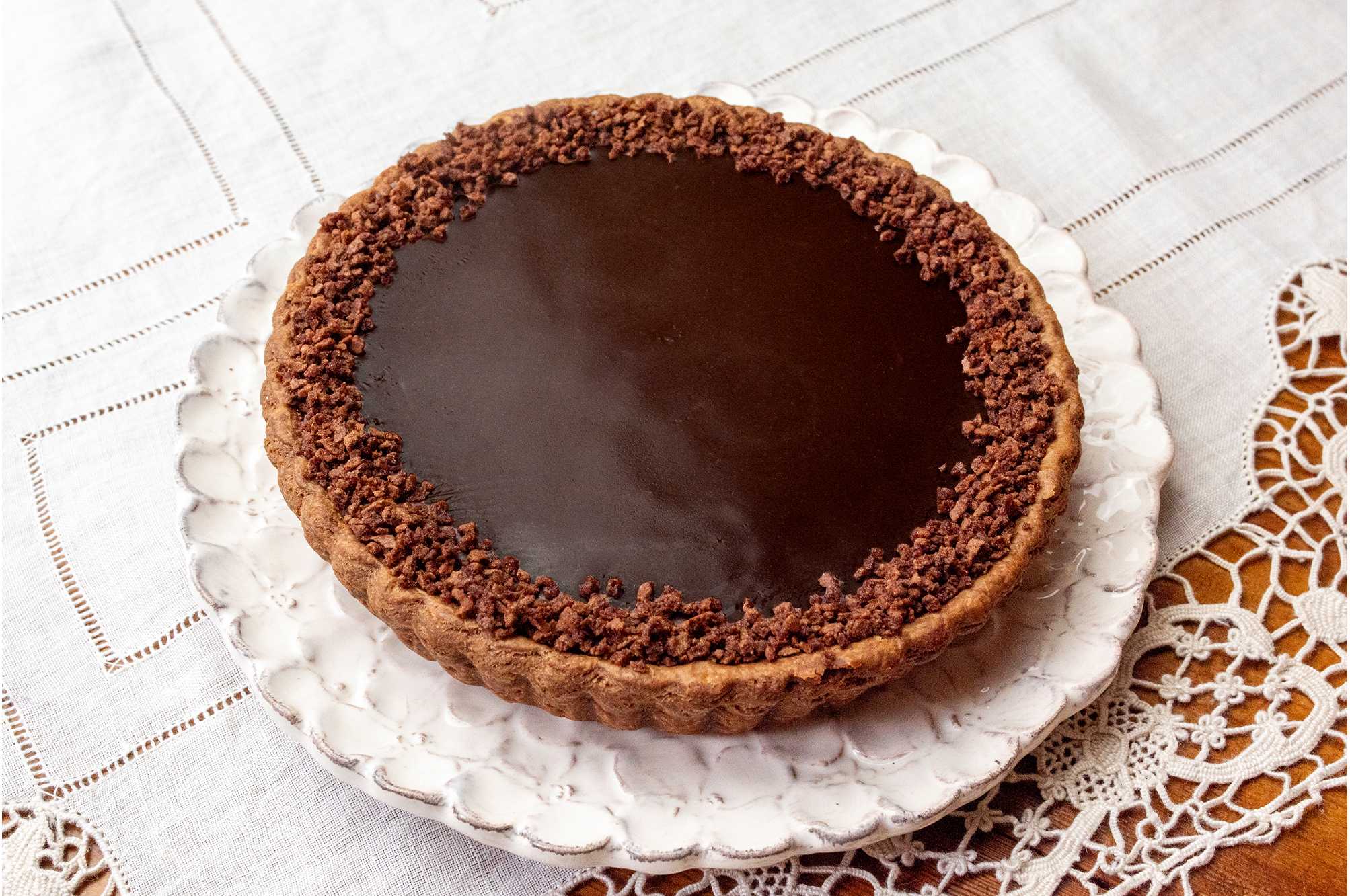なめらかなチョコレートクリームと濃厚なブラウニー、食感の異なるチョコレートを重ねた味わい深いタルトです。