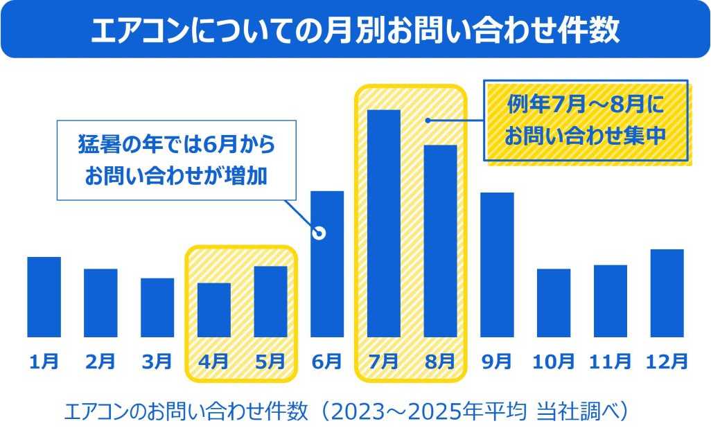 例年、エアコンのお問い合わせや点検のご依頼は、エアコンを使い始める6月頃から増え始め、7月、8月に集中します。混雑により暑い時期に修理対応をお待ちいただく場合があるため、本格的に暑くなる前の4月~5月に試運転を行い、早めに準備を済ませていただくことをご提案しています。