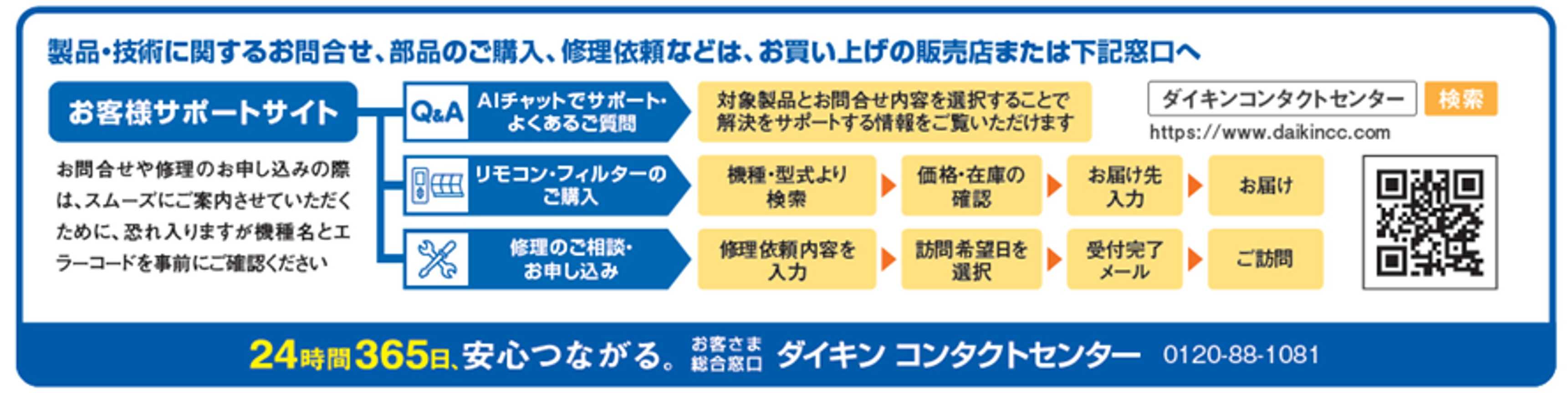 エアコンは日常的に使用される一方で、夏場の不具合や故障が発生した際には生活への影響も大きい家電です。こうした中、当社では24時間365日対応の問い合わせ窓口を設置するとともに、全国にサービス拠点を整備し、修理や部品手配を含めた対応体制を構築しています。 また、パーツセンターを通じて部品の供給体制も整備しており、必要な部品を迅速に届けられる仕組みとしています。これらの体制により、使用中に不具合が発生した場合にも、状況に応じた対応が行える環境を整えています。