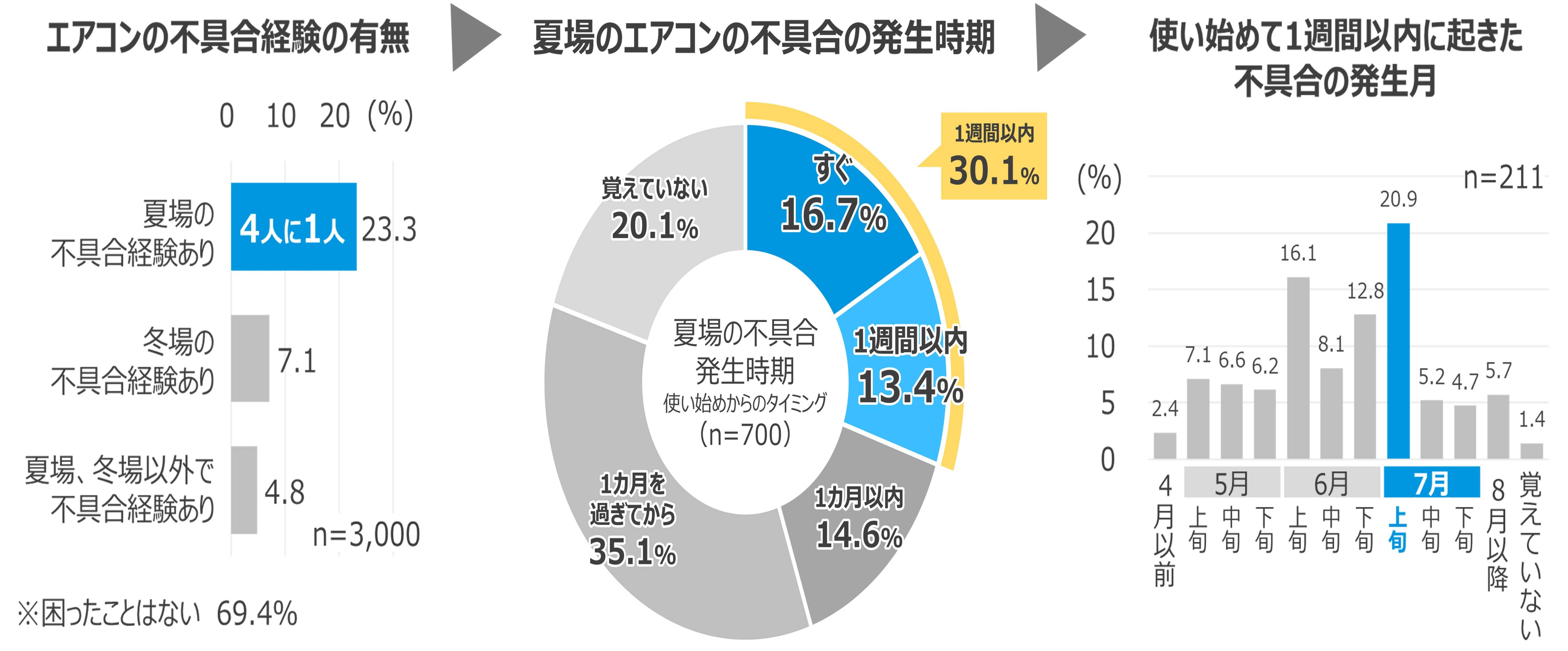エアコンの不具合の経験について聞いたところ、夏場にエアコンの不具合を経験した人は約4人に1人(23.3%)で、不具合が発生したタイミングは使い始めてから「1週間以内」が約3割(30.1%)を占め、1週間以内の発生月としては「7月上旬」が最も多い結果となりました。暖房シーズン後、使用していないエアコンを気温の高い時期にいきなり使い始めることで本体に負荷がかかりやすくなり、不具合が生じやすくなる可能性もあります。