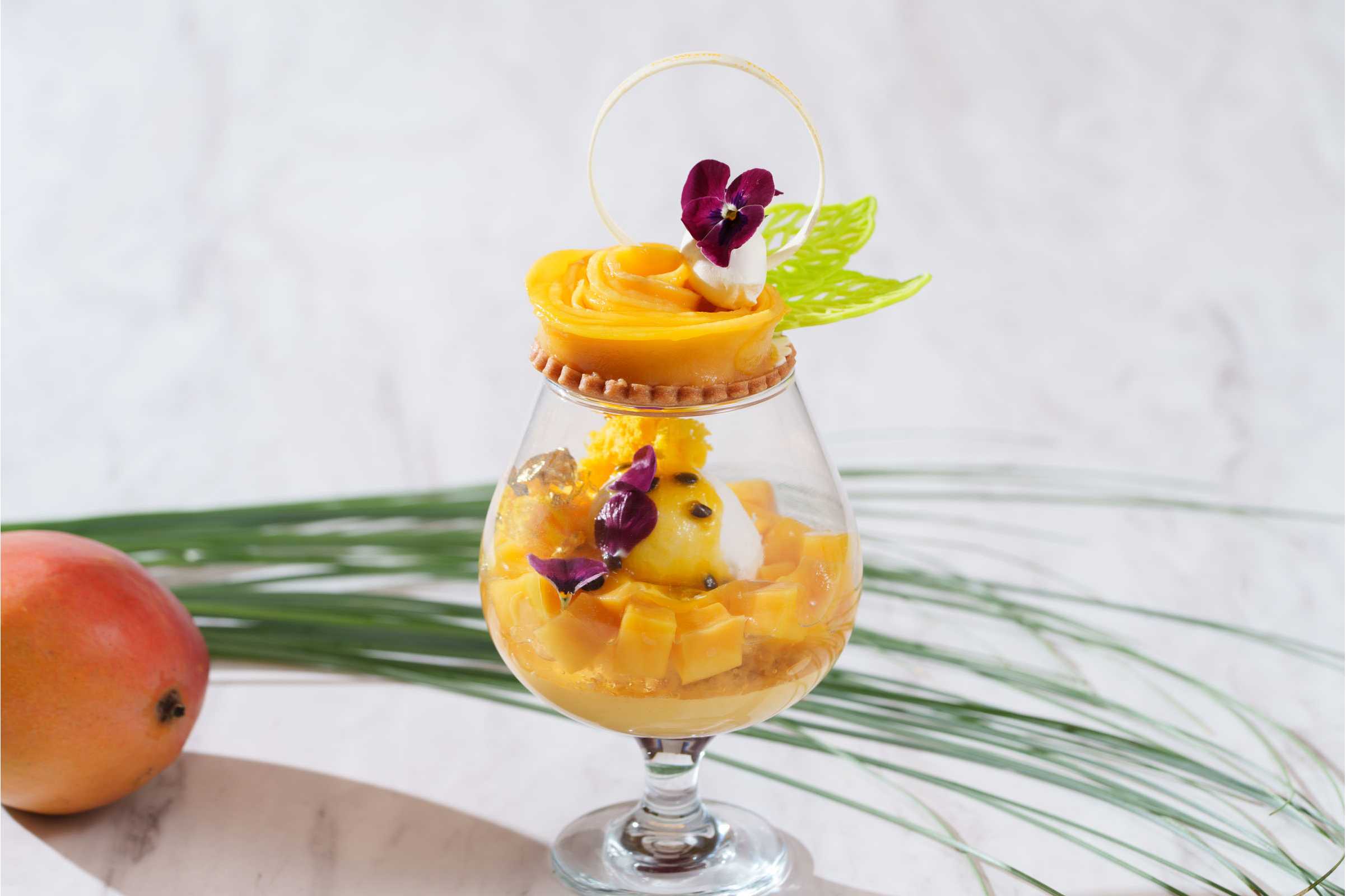 季節のフルーツや食材が持つ美味しさを最大限に引き出した、パティシエのイマジネーション光るパフェ。日の光をたっぷりと浴びた国産マンゴーを贅沢に使用しました。なめらかなくちどけのマンゴープリンや、ジューシーな果肉、マンゴー生地のスポンジなどを重ねています。さらに、マンゴーをスライスしてトップにお花をあしらいました。