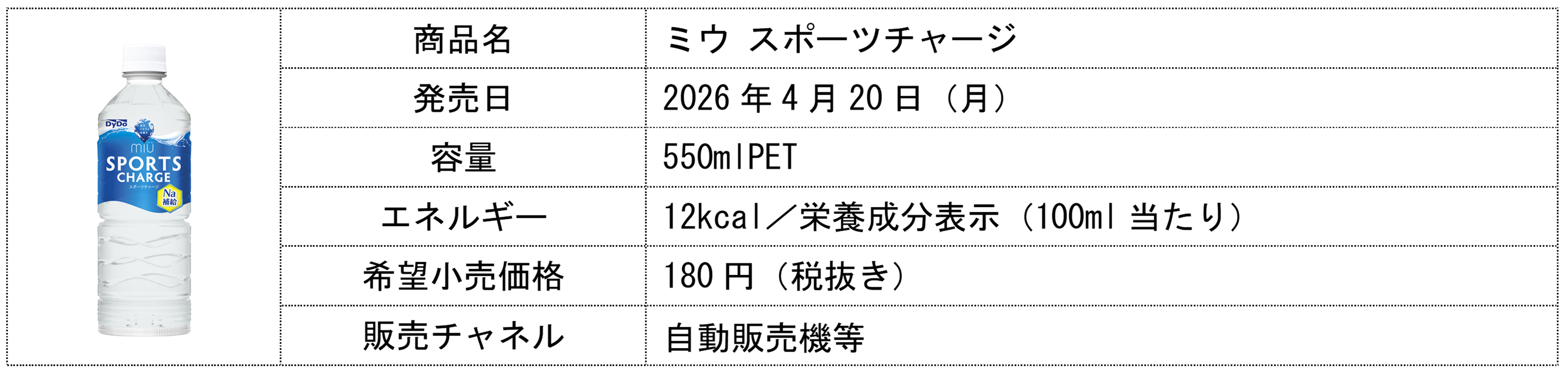 このたび発売する「ミウ スポーツチャージ」は、後切れすっきりとした味わいに仕上げるとともに、ナトリウムを40mg以上(100ml当たり)配合し、熱中症対策※3にも適した飲料です。