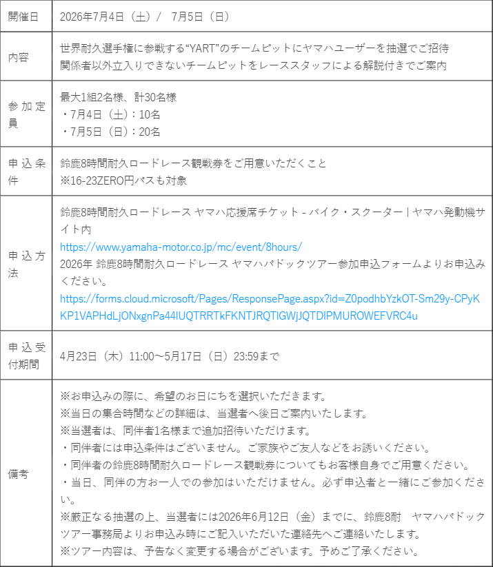 ヤマハ発動機販売株式会社は、2026年7月3日(金)~7月5日(日)に開催される「2026 FIM世界耐久選手権"コカ·コーラ" 鈴鹿8時間耐久ロードレース 第47回大会」において、7月4日(土)、5日(日)の2日間、「鈴鹿8耐 ヤマハパドックツアー」を実施いたします。