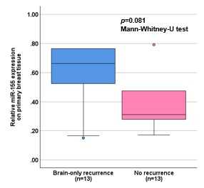 さらなる検証で、乳癌無再発群との比較では、脳単独再発群においてhsa-miR-155-5pの発現が高い傾向が見られた。(p=0.081)