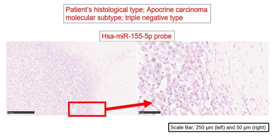 追加検証で、乳癌無再発群との比較では、脳単独再発群においてhsa-miR-155-5pの発現が高い傾向が見られました(p=0.081)。(図3)また、In situ hybridizationによって、hsa-miR-155-5pは乳腺原発巣の癌部に均一局在していることが示されました。(図4)