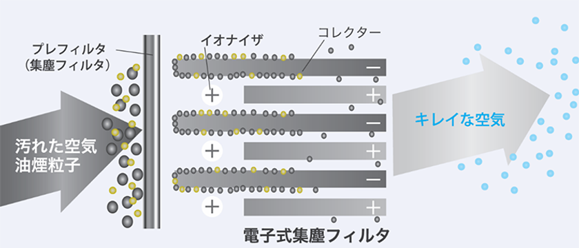 電子式集塵フィルタは粒子を帯電させて効率的に捕集する構造を持ち、フィルタ目詰まりによる風量低下が起こりにくい点が特徴です。これにより、稼働初期から長期間にわたって安定した吸引性能を維持します。