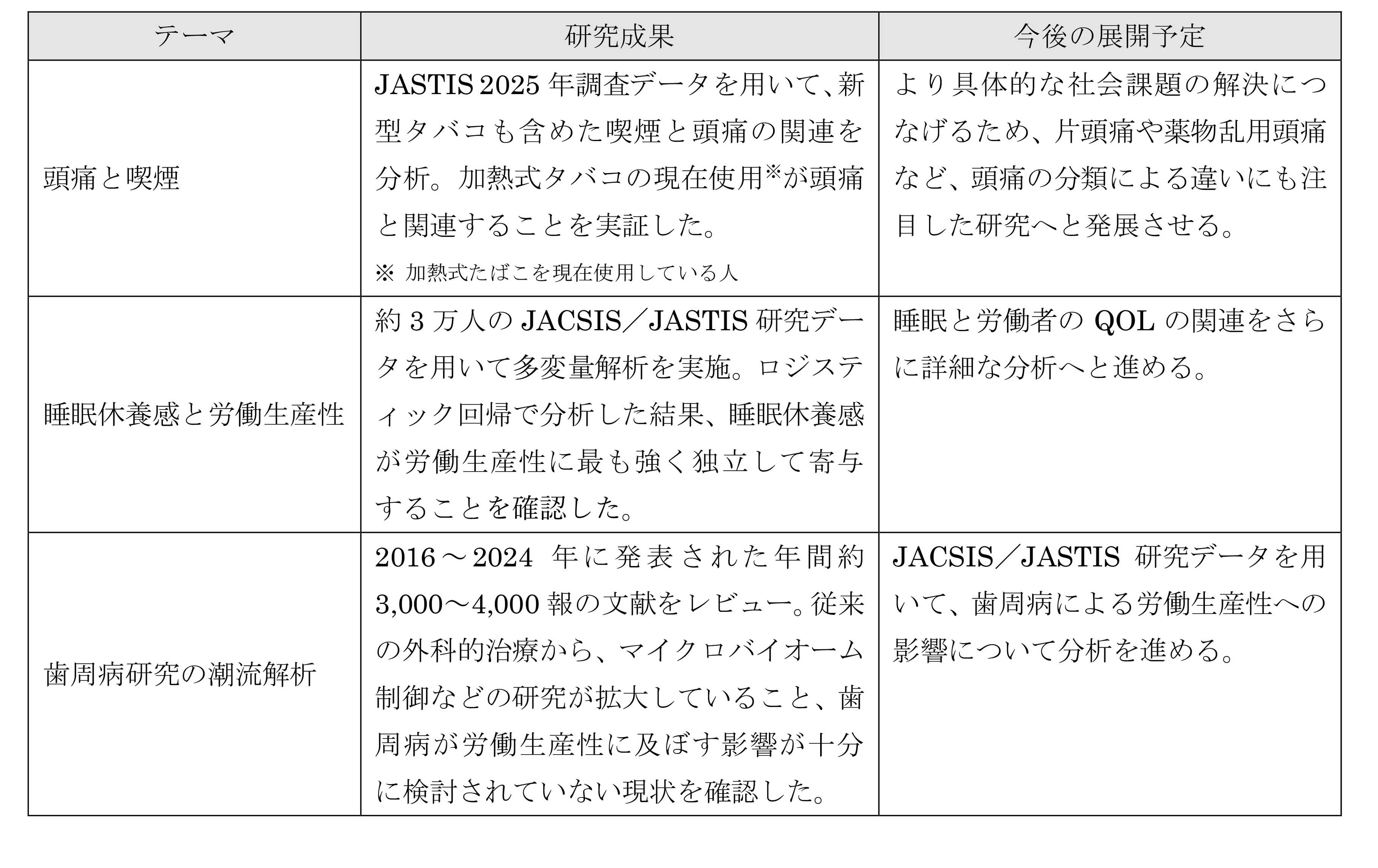 今回2つの学会では、頭痛と喫煙、睡眠休養感と労働生産性の関連性ならびに歯周病に関する最新の研究動向の分析結果についてそれぞれ発表しました。今後、信頼性の高い論文として公表できるように研究を進めてまいります。