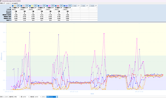 JIS B 0906の機械振動の状態を評価する指標をもとに、振動センサが設置された設備の状態を故障リスクのレベル別にグラフで可視化。最大10台のセンサで同時監視が可能です。