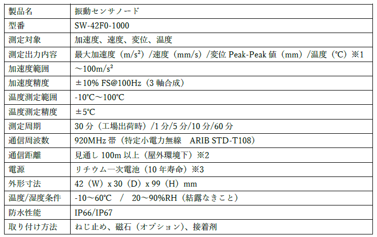 ※1:速度、変位は加速度からの演算で算出 ※2:使用条件により異なります。※3:3軸合成出力もしくは単軸出力に設定し、30分間隔で測定と無線送信をした場合