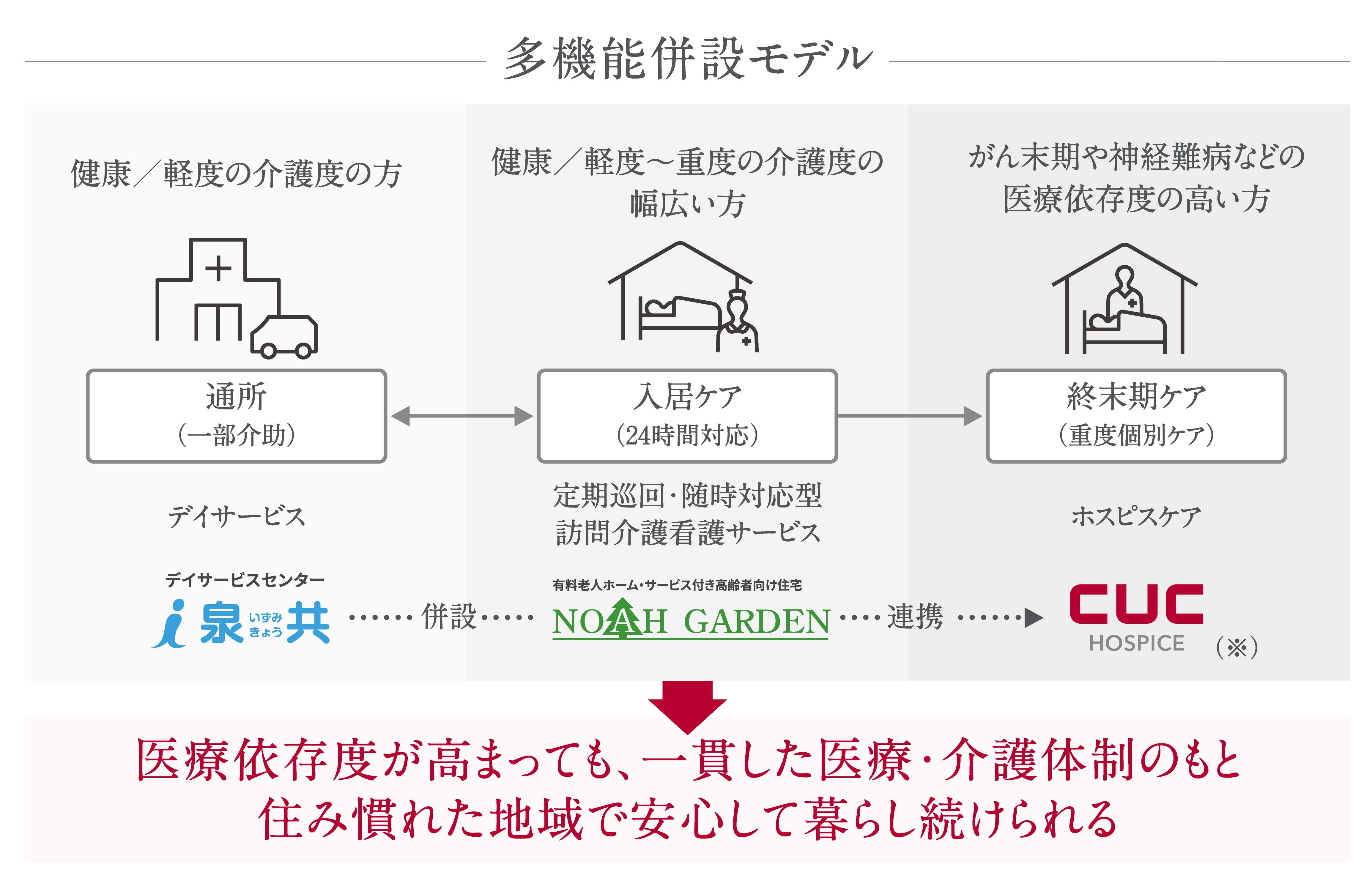住み慣れた施設で最期まで暮らしたいというニーズに応えるために、ご利用者さまの容体やご希望に応じて、適切な介護サービスを提供するCUC独自のモデルです。ホスピス型住宅と、同一施設内または近隣のノアガーデンの介護フロアと連携することで、要介護度が低い方から、がんや神経難病などの医療依存度が高い方まで幅広くご利用いただけます。またデイサービスも併設もしくは近隣に開設されており、施設のご利用者さまだけでなく、在宅で生活されている方にご利用いただくことが可能です。ご利用者さまが住み慣れた場所で暮らし続けられるよう、多様な医療・介護サービスを組み合わせて提供します。