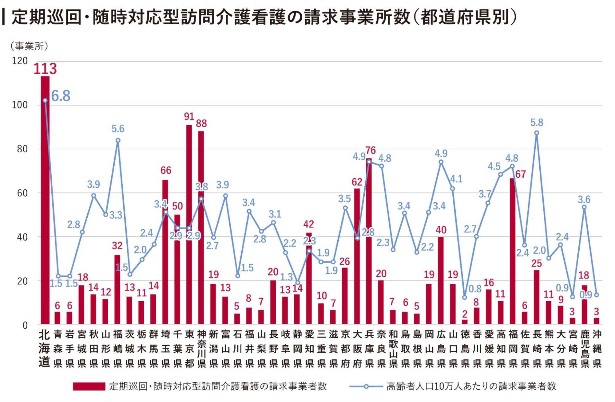 特に札幌は北海道全域から医療・介護環境を求めて高齢者が集まる傾向が顕著で、地域密着型サービスへのニーズも高まる中、北海道では「定期巡回・随時対応型訪問介護看護」の請求事業者数が113事業所と、全国で最も多くなっています(下図左軸)。